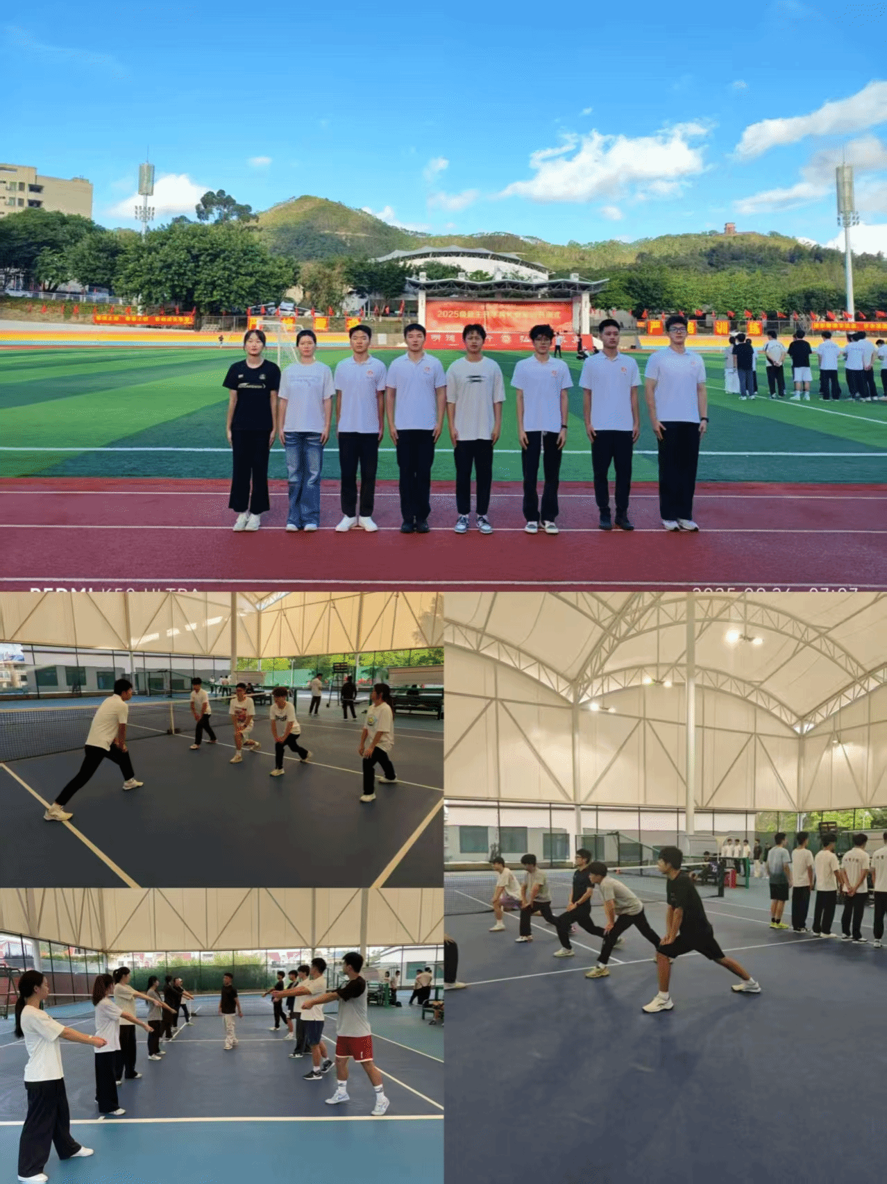 清晨,校园运动场上气氛活跃。网球馆内,学生在教师指导下认真完成热身与拉伸,动作标准、训练投入;篮球场上,队列训练整齐有序,教学讲解专注细致,展现了良好的专业素养与团队精神。同学们在晨光中积极投入体能训练和教学模拟,反复打磨动作细节,锤炼教学基本功。