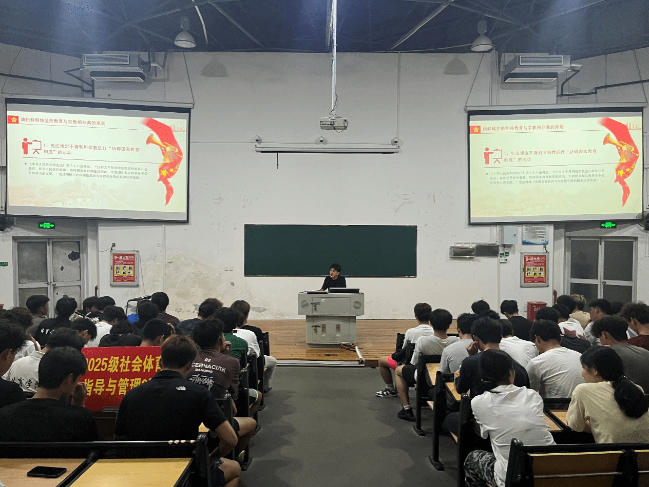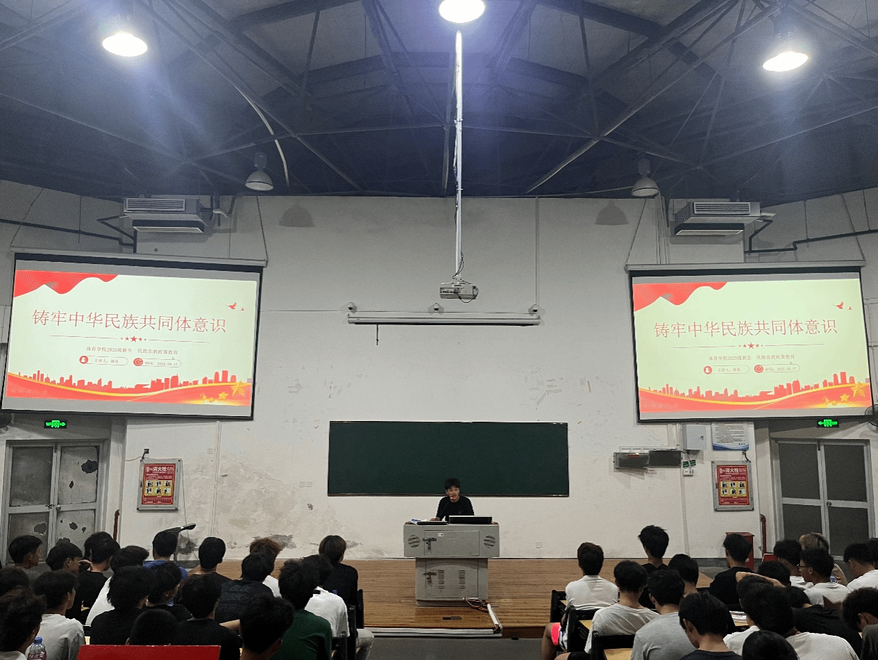 9月16日晚,体育学院在向高二号报告厅召开主题为“铸牢中华民族共同体意识”的新生民族宗教政策宣讲会。会议由2025级新生辅导员陈昊主讲。