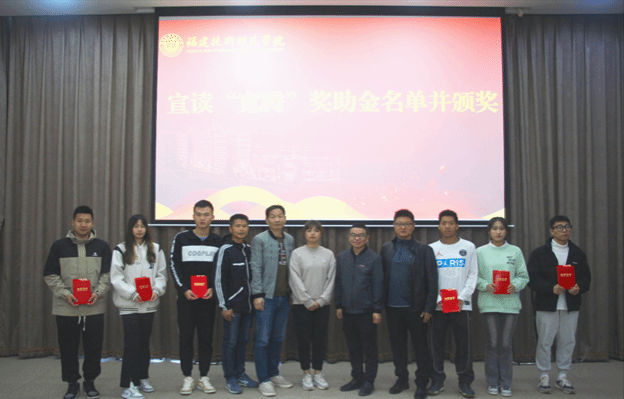李凤成副院长介绍了校友郭一腾奖助金基本情况。郭一腾为获得“宽腾”奖助金的同学颁奖,并号召同学们努力学习,学有所成。