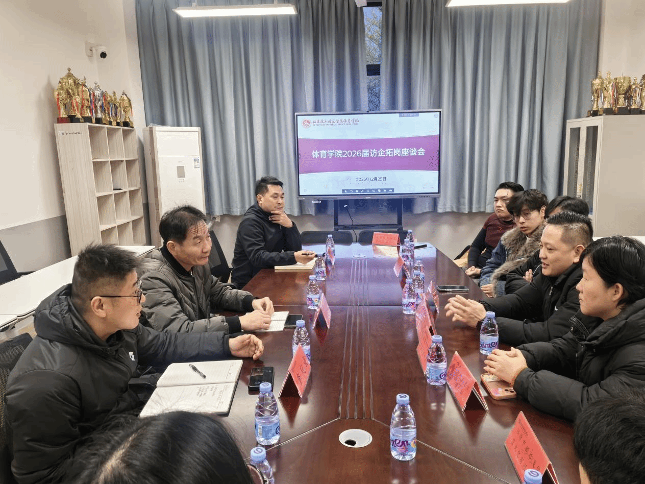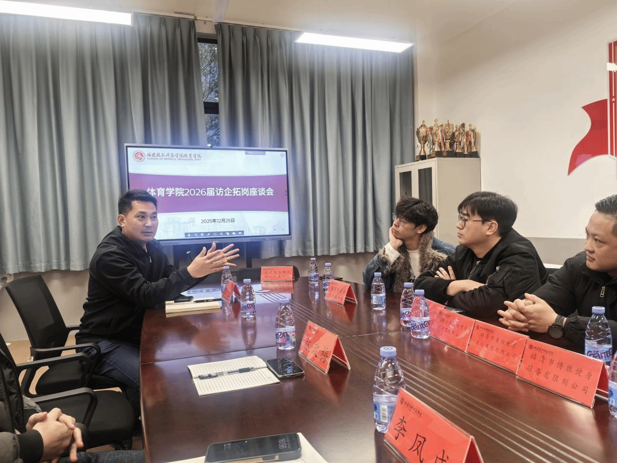 12月25日下午,我院在笃行2#208会议室召开2026届访企拓岗座谈会。学院党委书记林政梅、副院长李凤成、副院长王锋、毕业班辅导员,与福清市愽胜健身服务有限公司、福清市易动体育文化发展有限公司、福清市巨浪健身服务有限公司、福建技术师范学院附属中学、福建技术师范学院附属小学、福清晓金体育有限公司、福州金镱源体育场馆管理有限公司等多家单位代表共同参会。
