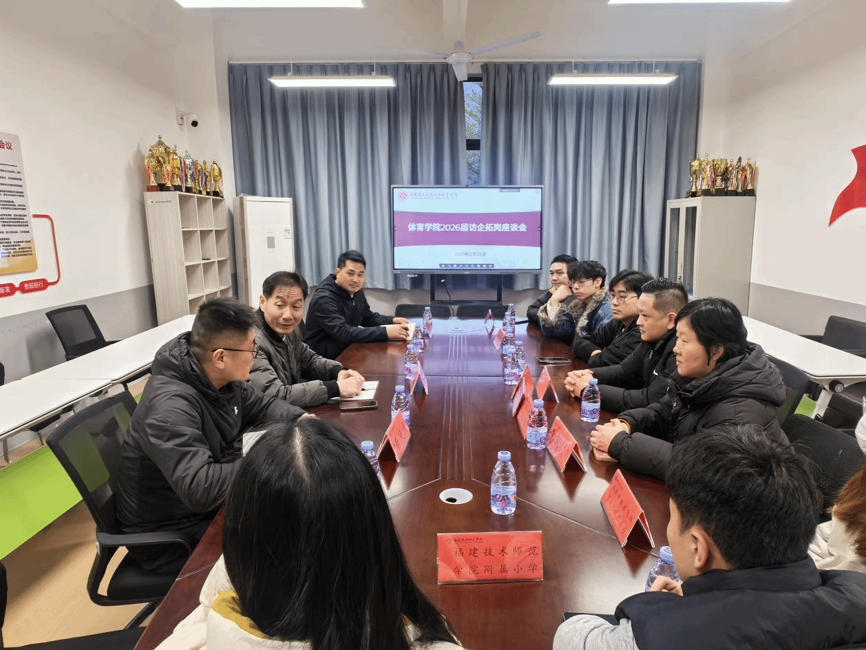 12月25日下午,我院在笃行2#208会议室召开2026届访企拓岗座谈会。学院党委书记林政梅、副院长李凤成、副院长王锋、毕业班辅导员,与福清市愽胜健身服务有限公司、福清市易动体育文化发展有限公司、福清市巨浪健身服务有限公司、福建技术师范学院附属中学、福建技术师范学院附属小学、福清晓金体育有限公司、福州金镱源体育场馆管理有限公司等多家单位代表共同参会。