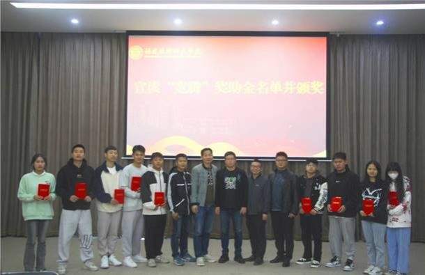 李凤成副院长介绍了校友郭一腾奖助金基本情况。郭一腾为获得“宽腾”奖助金的同学颁奖,并号召同学们努力学习,学有所成。