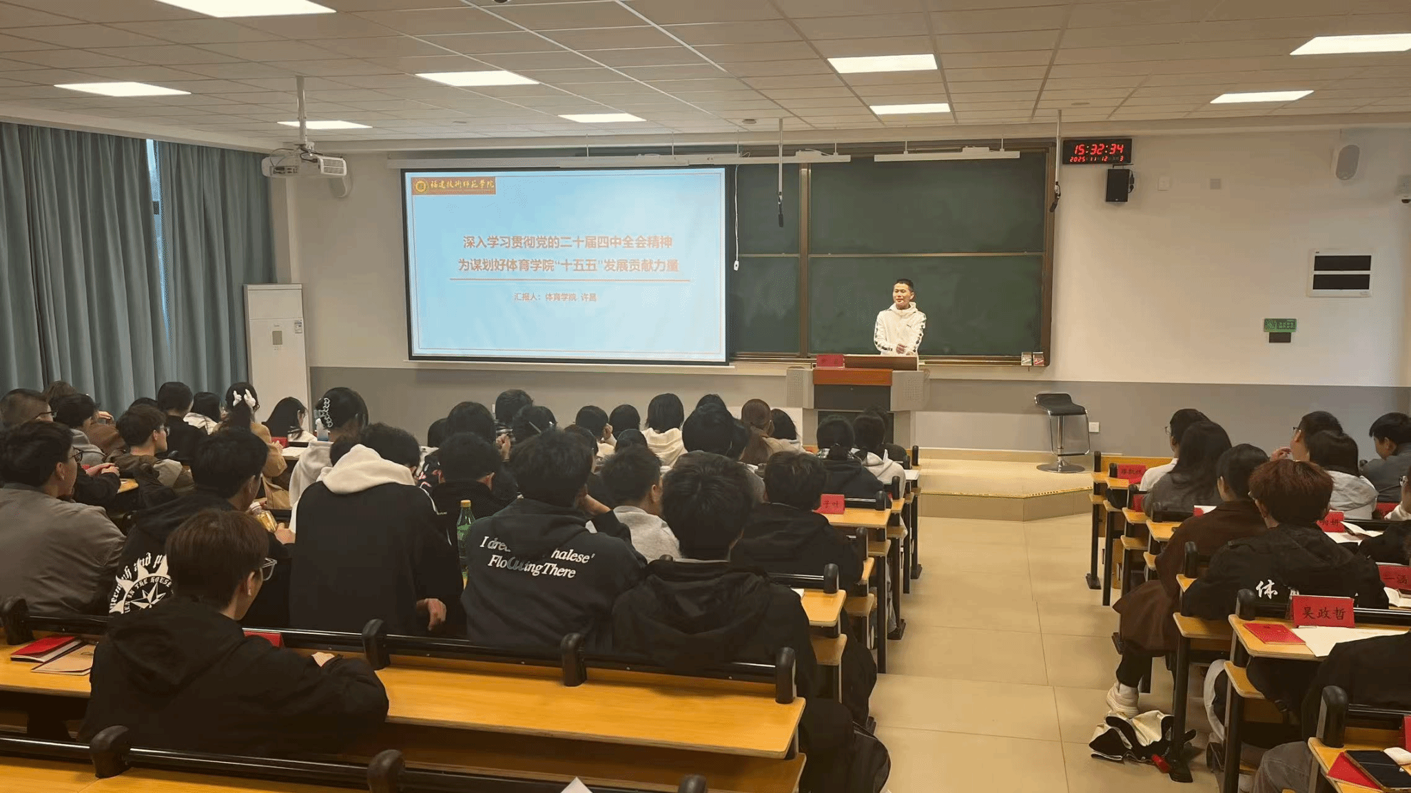 党课中,许昌副院长首先解读党的二十届四中全会精神,重点阐述全会审议通过的“十五五”规划建议,介绍其15个部分、61条的三大板块内容,以及“七个显著”总体发展目标与体育领域“统筹群众体育和竞技体育、加快建设体育强国”的发展方向。同时,他回顾学院“十四五”在党建、学科、师资等六方面成就,分析“十五五”面临的政策红利等机遇与硕士点建设等挑战,明确学院“十五五”六大发展目标。