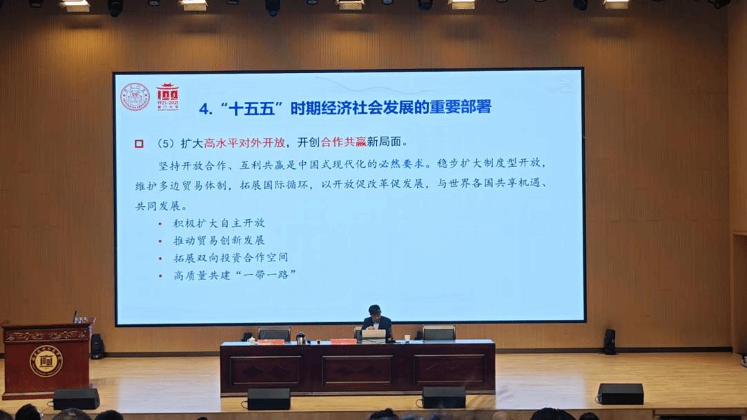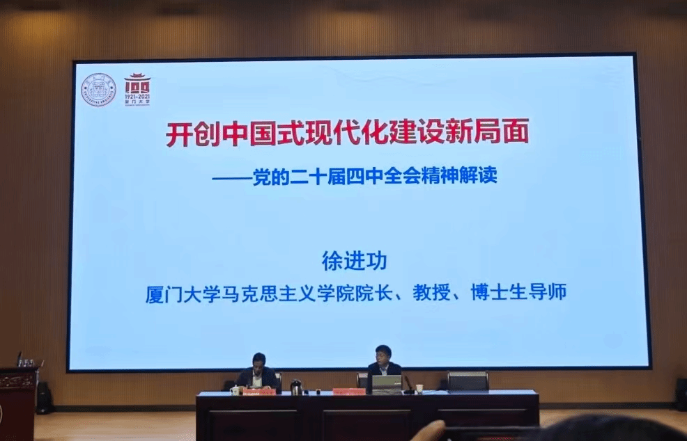 厦门大学马克思主义学院院长徐进功教授围绕学习贯彻党的二十届四中全会精神,从党的二十届四中全会的历史方位、“十五五”规划的逻辑主线与重要部署、“十五五”规划的践行路径三个方面,为参会人员作了主题鲜明、内容充实的专题辅导。